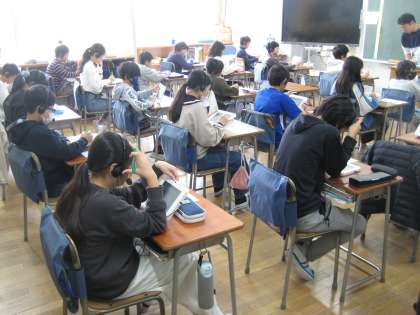 ヘッドセットを装着して「聞く」「読む」「話す」「書く」問題に取り組みました。