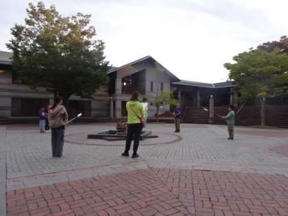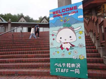 お風呂タイムを使って、中庭のキャンプファイヤー場では、4校のお友達で点火のリハーサルをしています。中庭には、ベルデスタッフの皆様手作りのねり丸メッセージボードが迎えてくれています。