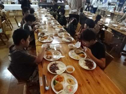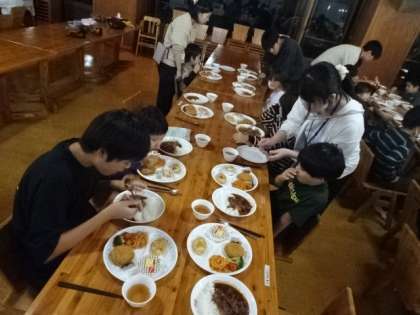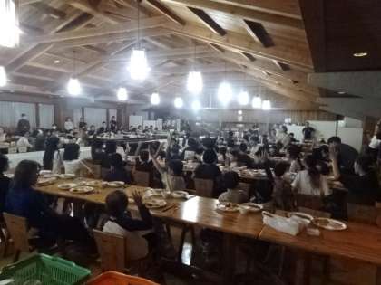 1日目の夕食。いただきますの前に4つの学校がそれぞれ挨拶をしました。4校それぞれ元気な挨拶が素敵でした。お腹がすいているので、みんなおいしくいただいています!