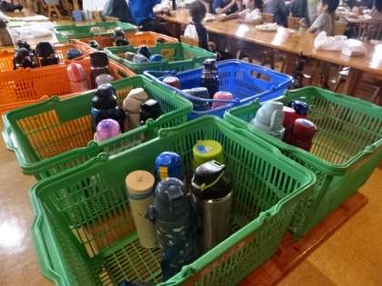 今日使った水筒は、食堂に集めて明日の朝に支援員の皆様が水やお茶を入れてくださいます。