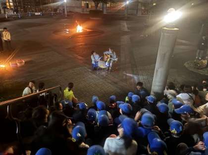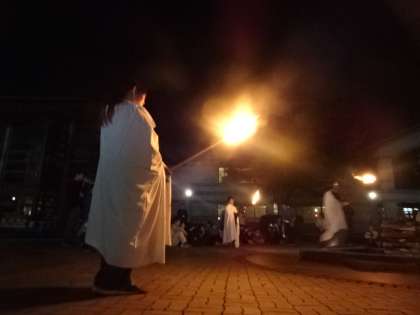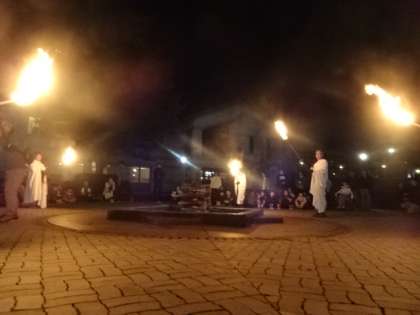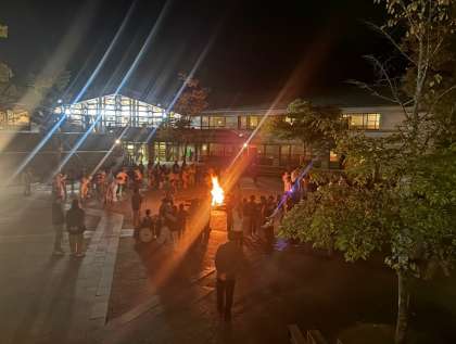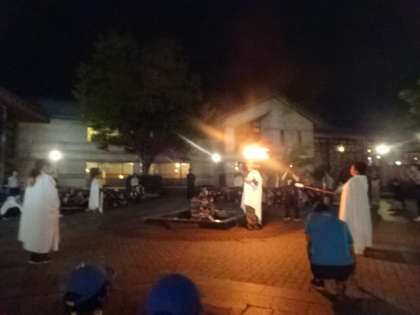 1日目の夜は、4校合同のキャンプファイヤーを行いました。ベルデ軽井沢の中庭にはキャンプファイヤーができる施設が整っています。火の神と火の子が入場。谷原小からも火の子が参加しました。火の神から1校ずつ火をもらいます。それぞれの学級の願いが込められた火です。谷原小には「幸せの火」を火の神からいただきました。どんな火をもらいたいかは、移動教室前にみんなで考えたそうです!無事点火が終了し、キャンプファイヤーの火が燃え上がりました!