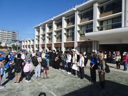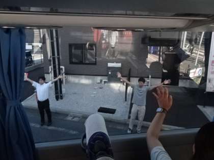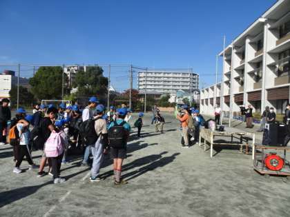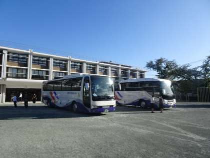 校庭にバスが停められているので、安心してバスの乗車ができる谷原小は本当に恵まれています。いつもは閉まっている南門があけられて先生方がバスの誘導をしてくれました。最後まで手を振ってバスは出発です!