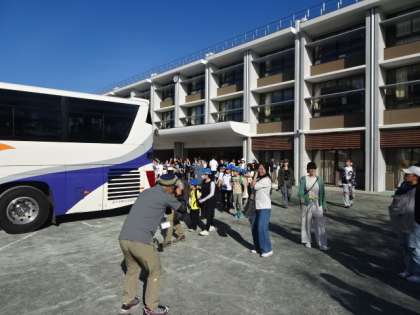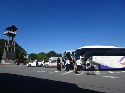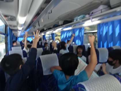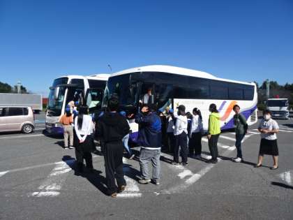 学校を出たのは予定よりも10分程遅れましたが、最初の休憩場所の甘楽(かんら)パーキングエリアには予定よりも10分早く到着。道路は順調で、みんな元気に過ごしています。初日最初の目的地の池の平湿原にバスは向かいます!