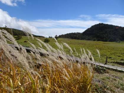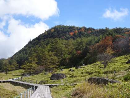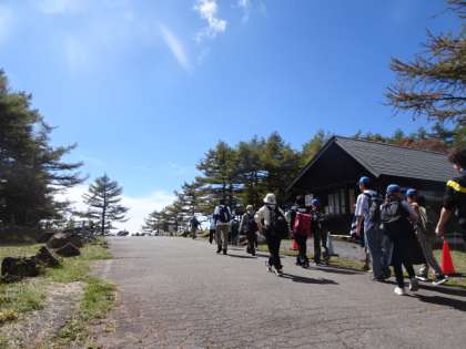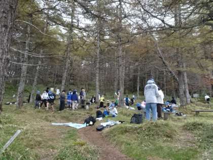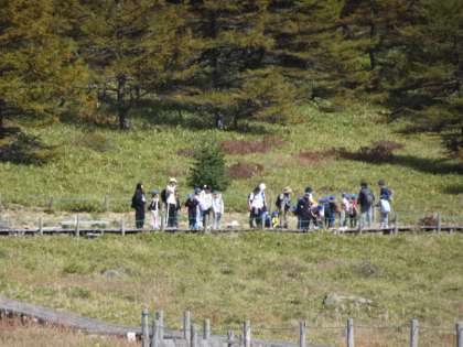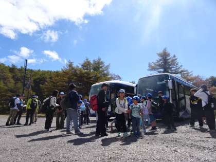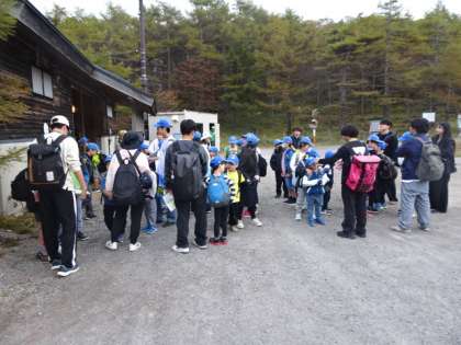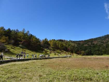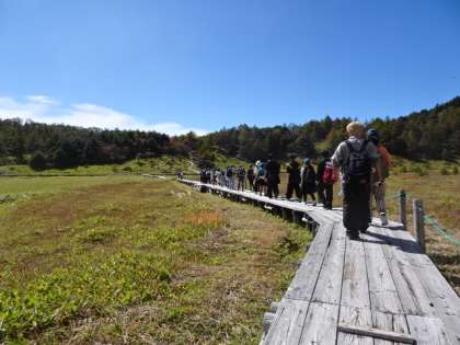 池の平湿原にむけて、東部湯の丸スキー場の方をどんどんバスで上がっていきます。標高が上がっていくにつれて次第に紅葉がきれいに見えてきました。お天気がとてもよいです。昨日も軽井沢に来ていたカメラマンさんが「昨日まではお天気が悪かったので、今日はよかったですね!」と教えてくださいました。集合のときは、5・6年生のリーダーさんが先頭で下級生のお友達をまとめてくれています。湿原の入り口の方に向かってあるいていきます。