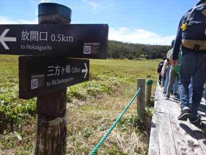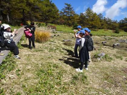 遊歩道をすすんでいくと池の平湿原が目の前に広がってきました。6年生は担任のと一緒に記念撮影をしました。学年ごとに撮影をしました。広い湿原を前にくすのきのお友達は「ヤッホー」とさけんでこだまを聞いて喜んでいました。しばらくみんなで「ヤッホー!といいながら木道を歩いていきました。お天気と景色が最高です!