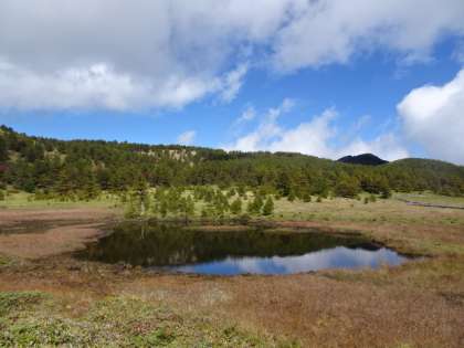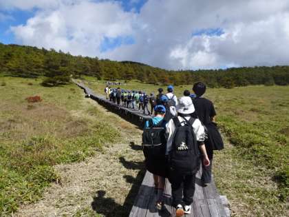 池の平湿原の木道を歩いていくと鏡池がとても美しかったです。4・5・6年生と1・2・3年生が分かれて歩きました。写真の下は、1・2・3年生の様子です。