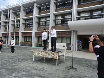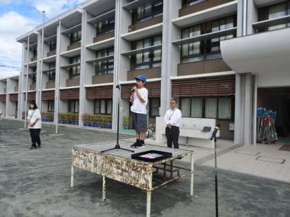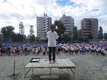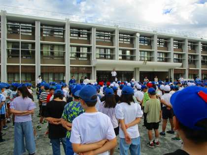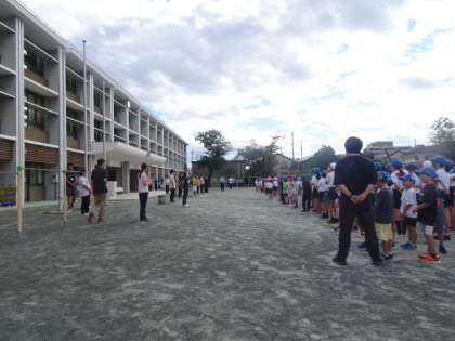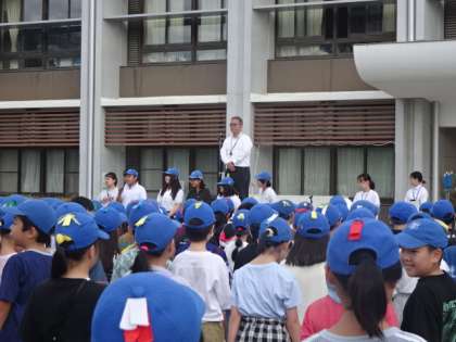 10月6日の全校朝会は、校庭で行いました。今週も6年生のあいさつで元気にスタートしました。私からは、運動会の練習が本格的にスタートするということで、成功の反対は?ということを伝えました。「成功」の反対は「失敗」ですが、もう一つは「何もしないこと」「挑戦しないこと」と言われていることを伝えました。発明王のエジソンの言葉も紹介し、毎回の練習に挑戦してほしいことを伝えました。それから、水曜日から3日間くすのき学級が宿泊学習に出かけることを紹介しました。みんなで「行ってきます!」「行ってらっしゃい!」の挨拶をしました。