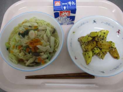 今日の献立は「野菜タンメン・大学いも・牛乳」です。