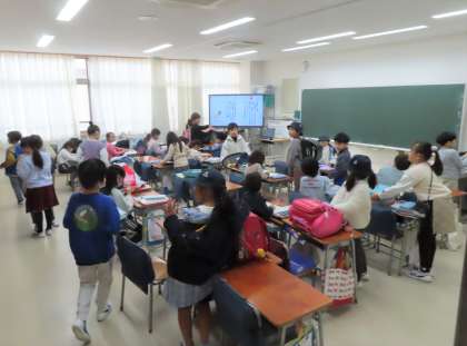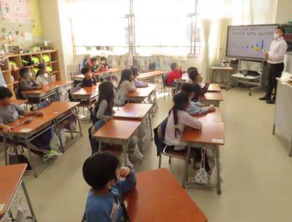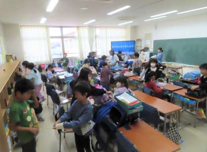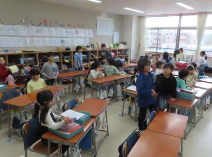 朝の会が始まる前に、「おはよう!」の声をかけ合っています。今日は何人にあいさつできたかな?