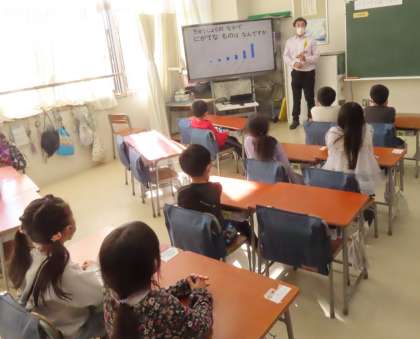 「ひのまる」の曲をドレミで歌いました。これからトーンチャイムを使って合奏をします。久しぶりなので、使い方の注意を確認しています。