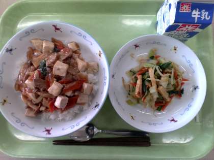 ・豆腐と豚肉のあんかけ丼 ・カリカリ油揚げサラダ 《ランチタイム》 豆腐は、蒸した大豆をしぼって作った「豆乳」に「にがり」を入れて固めて作ります。日本で、古くから親しまれている食品の一つです。また、油揚げは、豆腐を薄く切って揚げたものです。 11/18 中休み