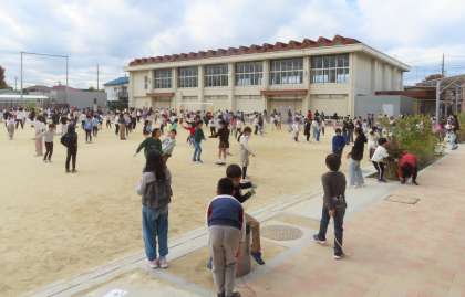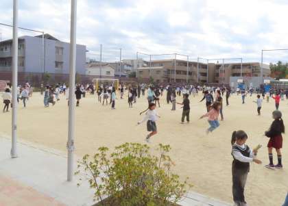 前半は人数が少なかった校庭ですが、この後、なわとび音楽がかかる頃には、たくさんの子供たちが集まってきました。上手になったかな?