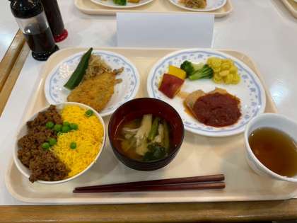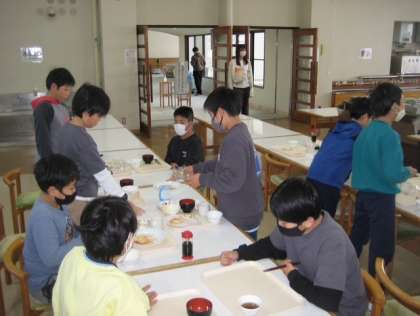 朝会後は朝食です。食べられる分だけ自分で選んで食べました。 5年 岩井移動教室 2日目その1