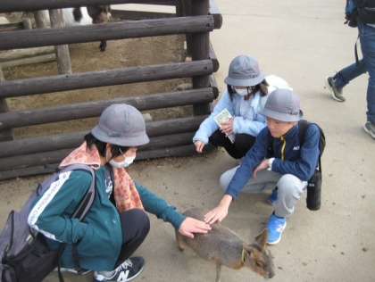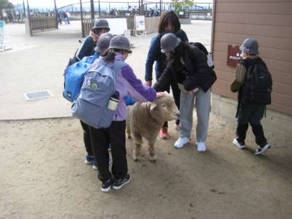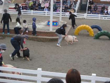 マザー牧場に到着しました。羊やヤギなどたくさんの動物と触れ合ったり、「こぶたのレース」見て楽しんだりしていました。 5年 岩井移動教室 3日目その4