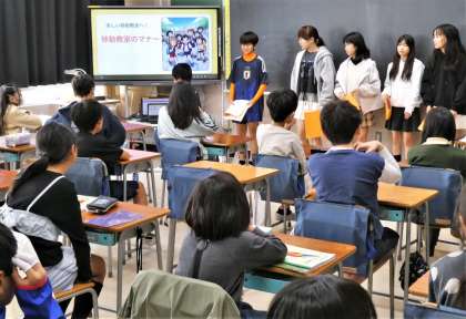 講師に松本江里さんと聴導犬のチャンプくんをお招きし、聴導犬についての出前授業が行われました。