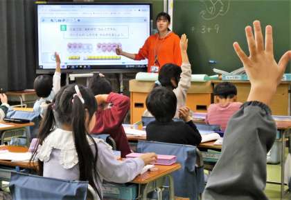 1年生は、算数の時間に「たしざん」の学習をしています。1学期までに、10の合成・分解についての学習や、10以下の1位数同士のたし算について学んできました。2学期は、いよいよ繰り上がりのあるたし算の勉強をしています。