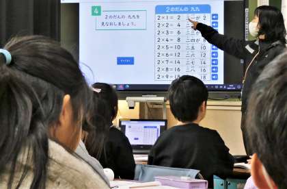 2年生は、算数の時間に「かけ算」の学習をしています。まず、かけ算が使われる場面を式に表したり、その答えの求め方を考えたりしてきました。そして、先週からいよいよ「かけ算九九」の学習に入っています。
