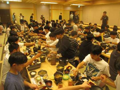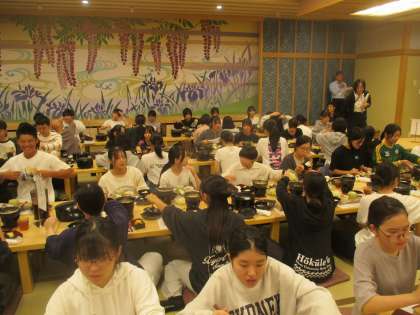 班行動が終わり、おいしい夕食をいただきました。班行動では少し雨が降りましたが、みんな元気です。