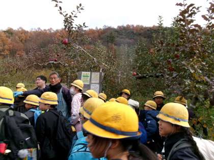 松井農園に着きました。リンゴの取り方を聞いて、さっそくりんご狩り。