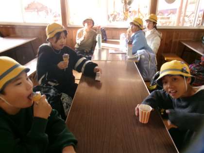 1号車のバスの中では、雪の富士山を見て感動し、バスレクのカラオケで盛り上がり、子供たちはハイテンションで楽しんでいます。