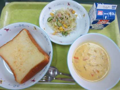 フレンチトースト 牛乳 かぼちゃスープ グリーンサラダ 今日の給食はブックメニューです。 『かぼちゃスープ』という絵本は、森の家に住む「ねこ」「りす」「あひる」の3びきがなかよく世界一おいしい『かぼちゃスープ』を作るお話です。ところがある日、ちょっとしたことでケンカになってしまいます。3びきの仲と世界一おいしい『かぼちゃスープ』はどうなってしまうのか。ぜひ読んでみてください。 今日の給食は絵本にでてくるかぼちゃスープをアレンンジして作りました。かぼちゃの甘みとまろやかな味が楽しめます。 第3学年 社会科 農園見学