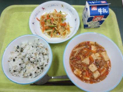 わかめじゃこご飯 牛乳 西湖豆腐 じゃがいもときゅうりの中華サラダ 今日の給食は、『じゃがいもときゅうりの中華サラダ』です。じゃがいもは素揚げしてあり、外はカリっとしています。ドレッシンングは、ごま油としょうゆ、お酢を混ぜ合わせて中華風に仕上げました。 素揚げしたじゃがいもときゅうりの食感を楽しみながらいただきましょう! 10月30日(木)