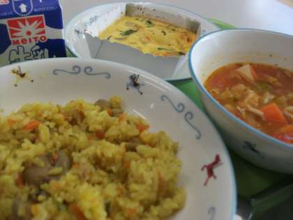 今日は「スパイシーピラフ・きのこのキッシュ・豆入りミネストローネ」でした。低カロリーでミネラルやビタミン、食物繊維が豊富なキノコ類は、秋が旬です。このキノコ類の栄養素的効果は、筋肉増強、強い骨、歯を作る、骨粗鬆症予防などです。