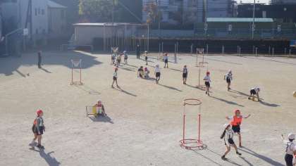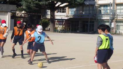 5年生「ゴール型ボール運動」です。「蹴る」技能が中心となる運動です。女子が積極的に動けないことが多く見られがちですが、全くそんなことはなく、全員がよく動き、声を掛け合い、外から「みる」児童も積極的にアドバイスをしていました。 こうした子どもたちの姿を見ていると本当に嬉しくなります。