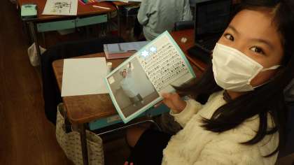 4年生が、学芸会で演じた自分の写真を取り込みながら、振り返りカードを作成していました。