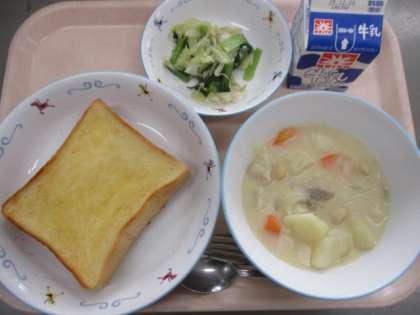 はちみつレモントースト 牛乳 豆乳のクリームシチュー グリーンサラダ 今日の給食【12月1日(月)】