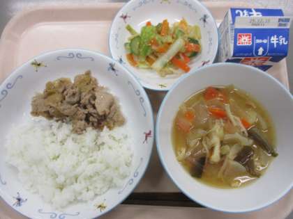ごはん 牛乳 豚肉の生姜炒め たまねぎのみそ汁 キャベツのさっぱりあえ 今日の給食【12月2日(火)】