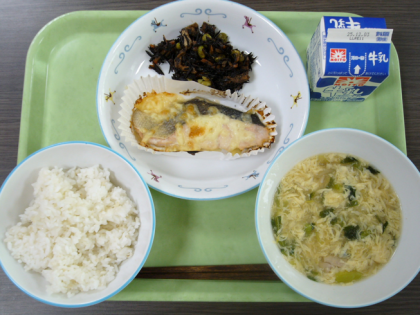 献立:麦ごはん、鮭の味噌チーズ焼き、ひじきと枝豆の炒り煮、むらくも汁、牛乳