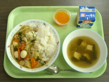献立:中華丼、わかめスープ、キャロットゼリー、牛乳