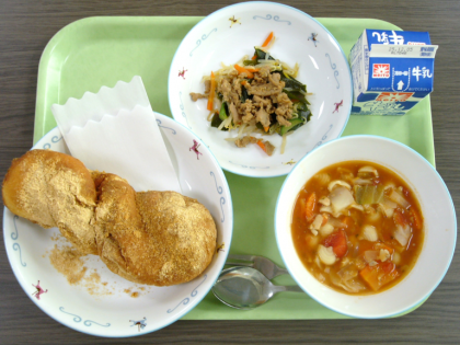 献立:きなこ揚げパン、焼き肉サラダ、ミネストローネ、牛乳