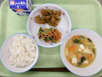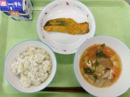 今日、10月10日は「10」を横にすると眉と目に見えることから、「目の愛護デー」です。目にいいと言われる「ビタミンA」や「β−カロテン」を多く含む、にんじんやかぼちゃを使った献立です。パソコンやタブレットの時間が多くなり、目が疲れている人もいると思います。食べ物を気を付けたり、緑の木々を見て目を休めたりしましょう。