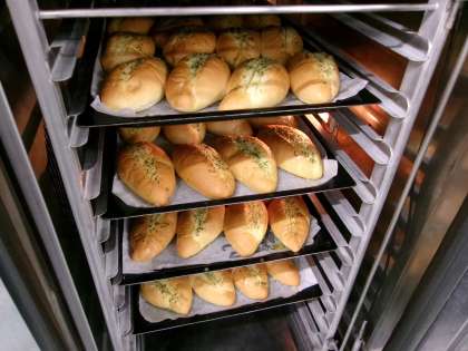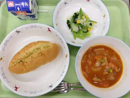 「ガーリックフランス」は、ソフトフランスパンにガーリックバターをぬって、オーブンで焼きました。程よく色づき、香ばしく焼き上がりました。「ブラウンシチュー」は豚の角切り肉を使って作りました。給食室の釜で煮込んだので、お肉が柔らかく仕上がり、パンにもよく合いました。「グリーンサラダ」には五十嵐農園のキャベツをたっぷり使いました。