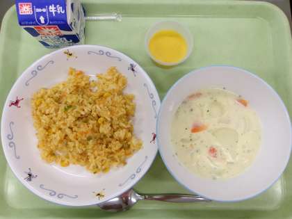 今日のスープには、米粉で作られたマカロニを入れました。米粉なので小麦粉のマカロニより弾力があり、もちもちとしていました。また、星の形をしていたので、探しながら食べている姿がありました。おいしくいただきました。