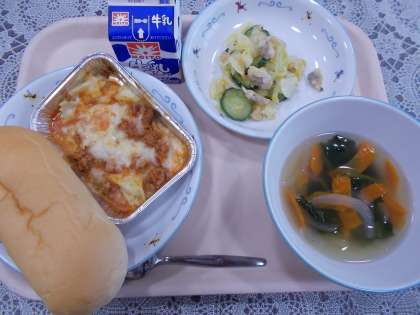 今日の給食は、ミルクパン、ラザニア、ひよこ豆のバジルサラダ、やさいスープ、牛乳でした。