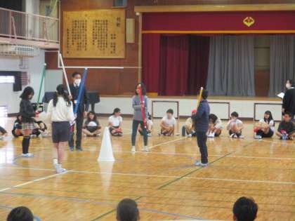 ミニハードル走に取り組んでいます。ハードル間の歩数やリズムよく走り越す動きに注意し友達とも見合いながら軽快に走りました。