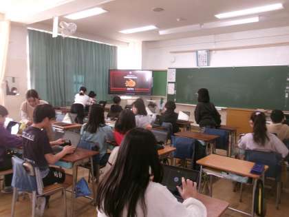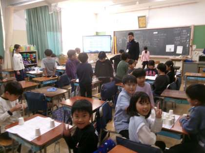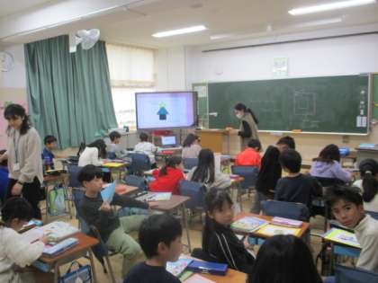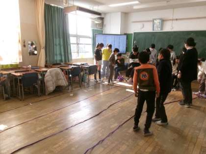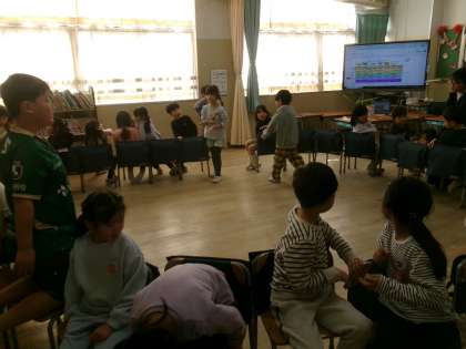 高学年のクラスの様子です。タブレットを使ったゲーム大会、足を使って紙テープを巻き取るゲーム、そして爆弾ゲームとクラスごとに楽しんでいます。