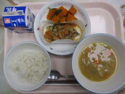 寒いこの時期にぴったりのメニューです。豚汁は具だくさんでだしがよくきいていて味に深みがあります。かぼちゃは一口サイズでさっぱりとした甘さがあります。今日もおいしくいただきましょう。
