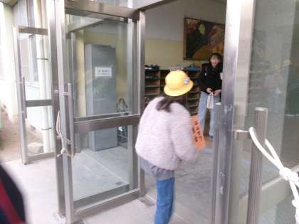一足早く靴箱に入り募金箱の準備をして、玄関前で募金の声掛けを行いました。