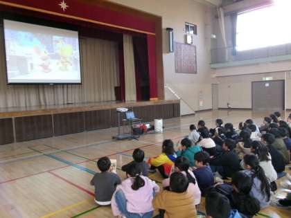 全校児童のいる前でも堂々と発表し、スライドも分かりやすかったです。