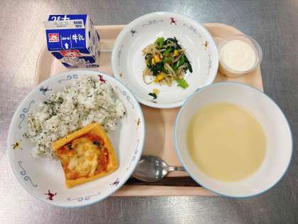 じゃこと大葉のごはん、油揚げのねぎ味噌チーズピザ、小松菜とベーコンのソテー、じゃがいものポタージュ、カップでりんごヨーグルト、牛乳