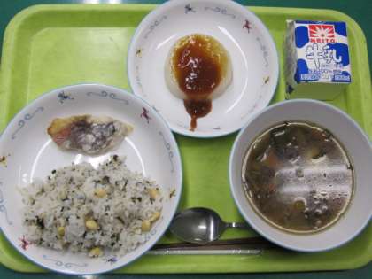 鮭のホイル焼き、油あげのサラダ、春雨スープ、みかんゼリー、麦ご飯、牛乳です。