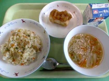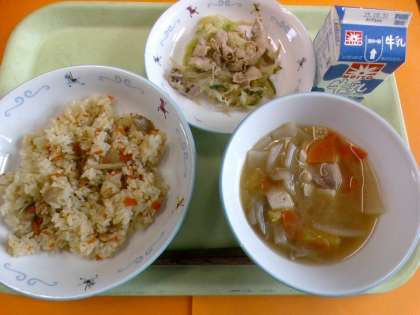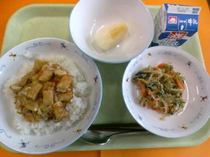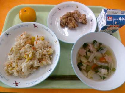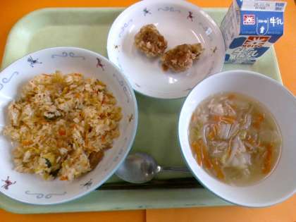 ユーリンチーは、鶏の唐揚げにしょうゆ味のねぎソースをかけて作りました。ごま油やねぎの香りがおいしさの決め手です。ソースをアレンジするだけで、料理のバリエーションが増えますね。そして、キムチチャーハンは3年生からたくさんのリクエストをもらいました。食欲の秋です。どのクラスももりもり食べてくれました。