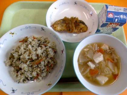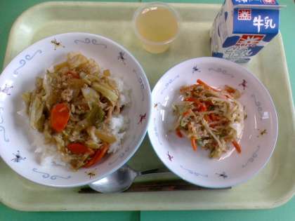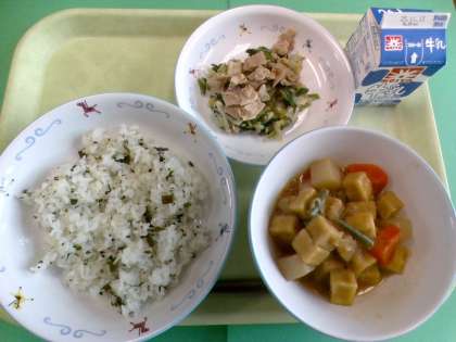 1年生が夏休みの宿題で、練馬区の「朝ごはんコンクール」に取り組みました。考えた朝ごはん献立を給食にアレンジして作りました。一つは「小松菜チャーハン」です。練馬区産の小松菜を入れたおいしそうな献立でした。もう一つは、「厚揚げのおろしがけ」です。練馬区産の大根をたっぷり使って、鉄分やカルシウム豊富な厚揚げを手軽に食べられる献立でした。給食では揚げ出し豆腐にアレンジしました。