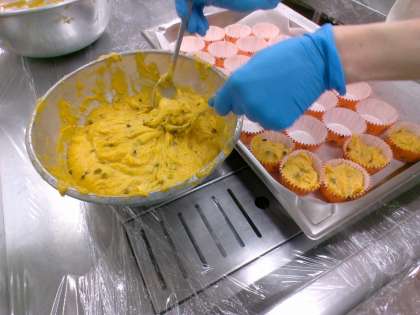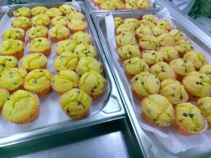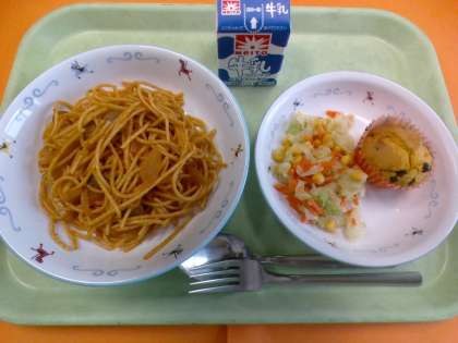 今日の給食はパンプキンケーキを作りました。かぼちゃは夏野菜ですが、追熟させた秋から冬に甘くなり、おいしく味わうことができます。給食室では、朝から生地を混ぜ合わせ、大きなオーブンでカップケーキを焼き上げました。ケーキを焼くときには、甘くよい香りが給食室いっぱいに広がりました。生徒のみなさんも「おいしい!」と言って、喜んで食べてくれました。