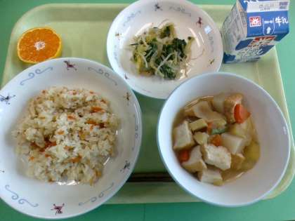 昨日11月3日は、「文化の日」でした。「文化」とは、人が作り出した考えや楽しみのことです。日本には色々な文化があり、食にも色々な文化があります。文化の日のころは、菊の花が香る季節です。今日は、食用の菊を使って、「菊花あえ」を作りました。そして、秋の五目煮は、旬のさつまいもや里芋が入っています。季節を感じて、味わいました。