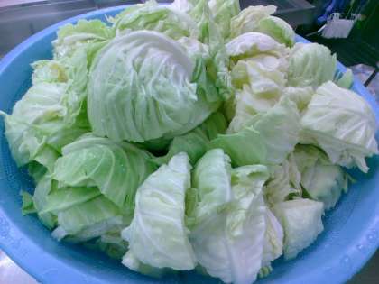 今日は、練馬区の小中学校で、練馬でとれた「ねり丸キャベツ」を使った地産地消給食です。練馬は、練馬大根が有名ですが、大根よりも多く収穫されるのが、キャベツです。キャベツ畑もたくさん見かけます。今日は、「ねり丸キャベツ」を70kg使って、ホイコーローとサラダを作りました。新鮮でおいしい「ねり丸キャベツ」を味わいました。